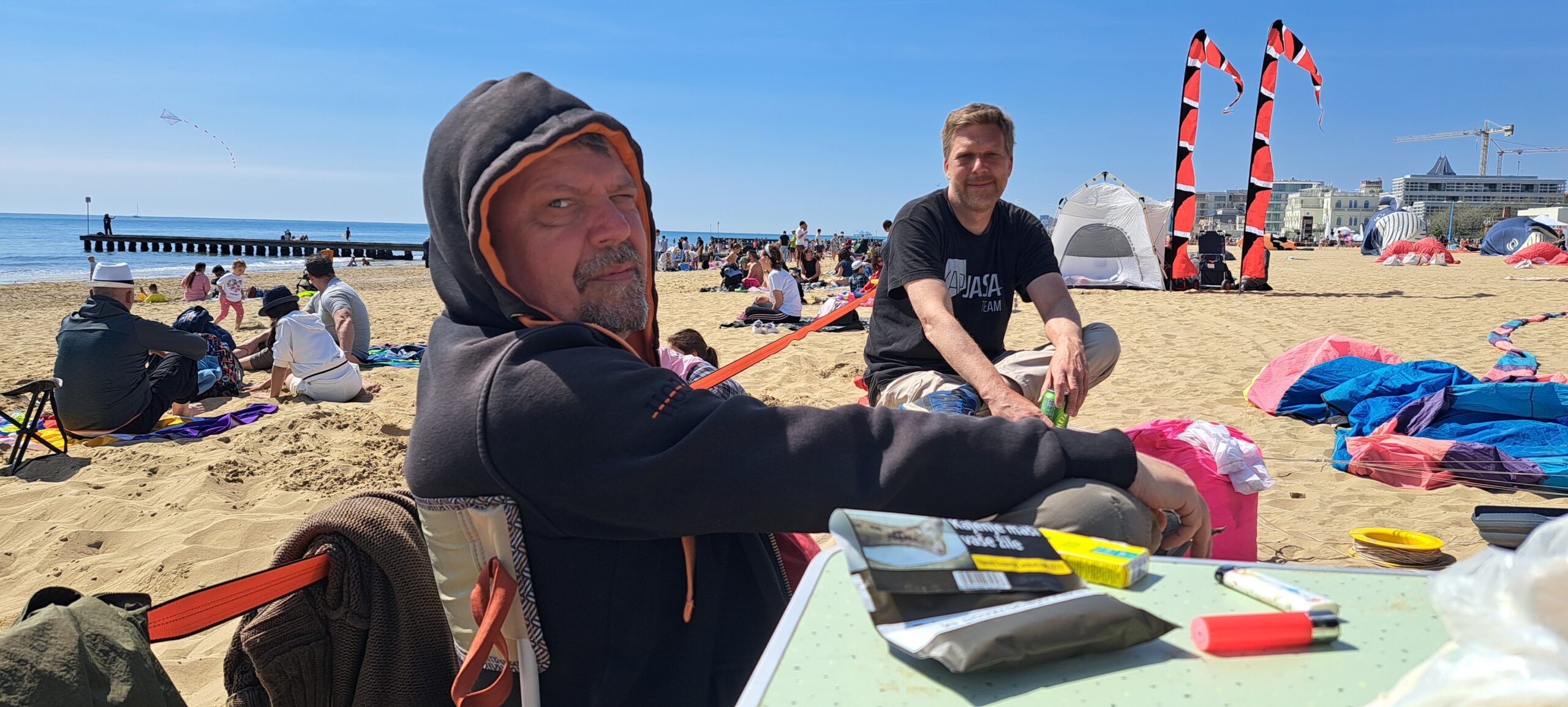 Which presents a problem – kiters can interact more or less exclusively with their arena neighbours. All the friends are all over the place, some of them an hour or two of hard walking through the soft sand away (Filippo and the team are aware of this, and they make it up in the evenings, gathering us all for fantastic dinners with plenty of socialising time). And sometimes our mischievous energy is a bit much for serious old-school kite flyers. This year, our primary victims were Robert, Andrea, Romy and Lucas, and their most patient and nice dog – and Petra with Gunther. Organised, professional… German.