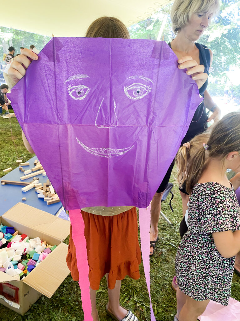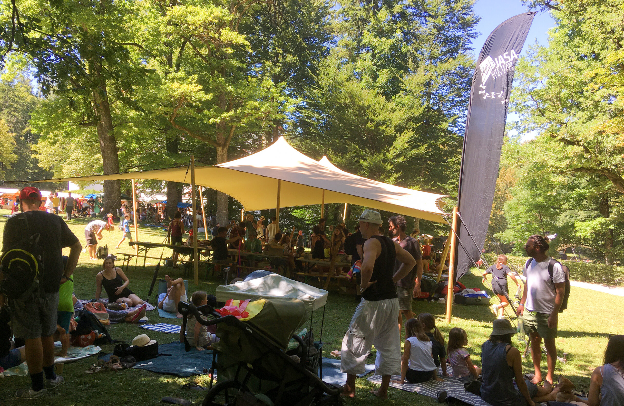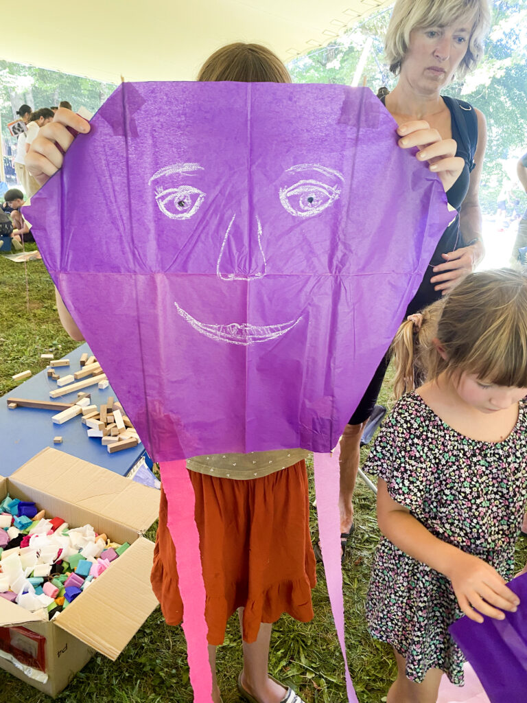 Nam so k sreči že na začetku rekli, da je festival orjaški, pa smo šli na polno: dva avtomobila, kup materiala za delavnice, še en kup zmajev, če bo pihalo – in pet postavnih zmajarjev, odločenih, da stotinam otrok pokažejo, kako se naredi zmaja.