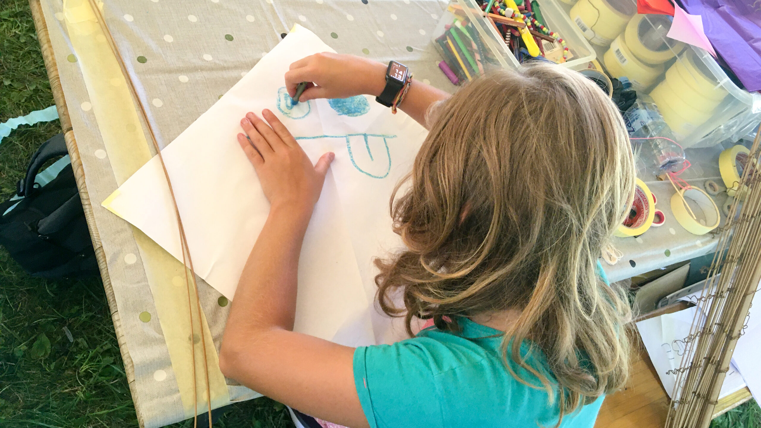 Ko sva prišla do Malih Butal, kjer se je delavnica imela zgoditi, naju je pričakal lično urejen delavniški kotiček – senčka, tri mize, klopi, flumastri, voščenke, voda – in kakih dvajset otrok, ki so naju pogledali z velikimi očmi in v en glas zapeli: