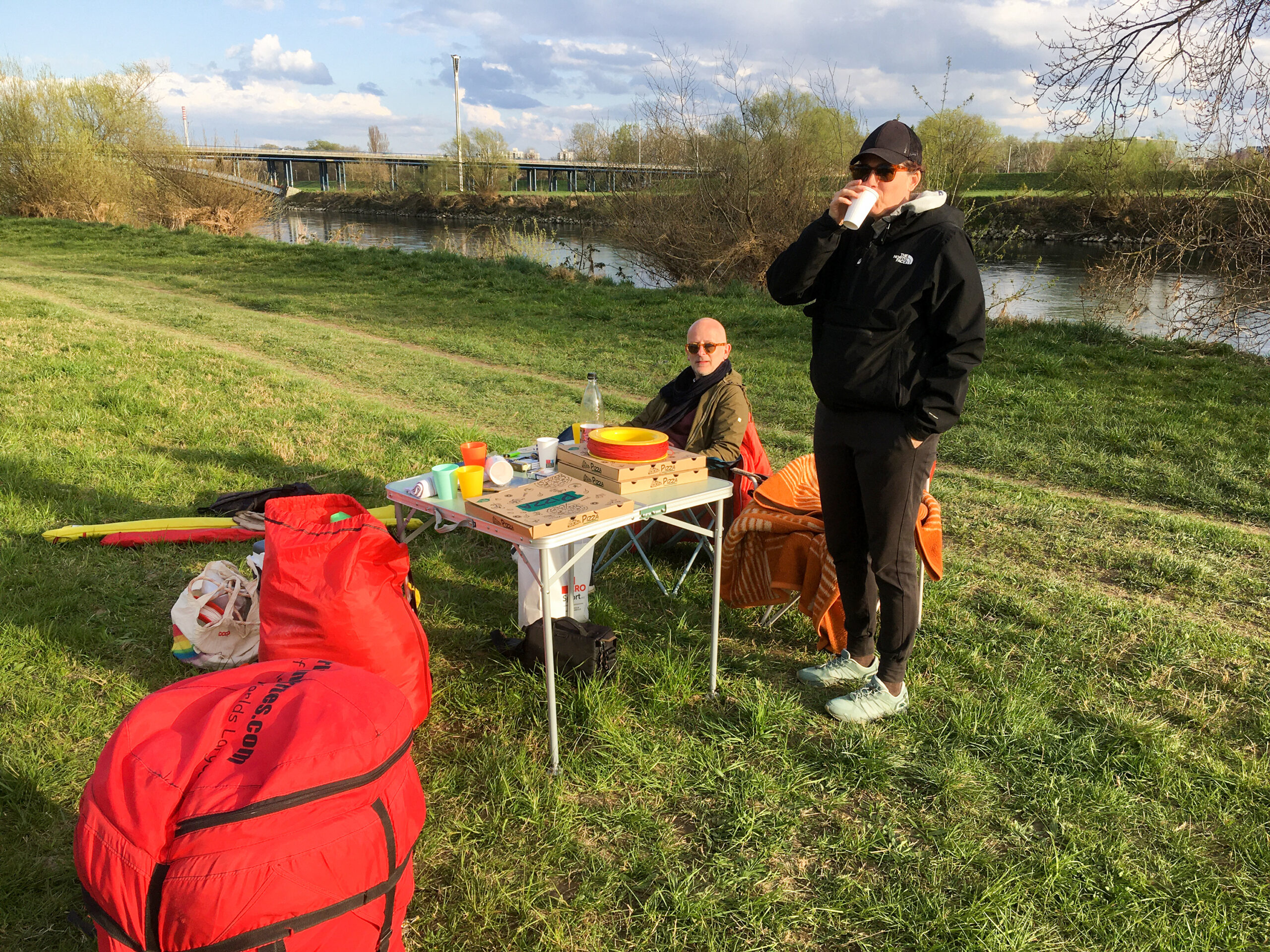 S seboj smo imeli mizo in stole, Žuža in Žare sta malo narezala, hladilna torba je bila polna mrzlih … Še pice smo si naročili, pa je dostavljalec kar ostal tam in buljil v nebo. Telefon mu je zvonil, a je gladko ignoriral lačne: pusti pice, glej zmaje!